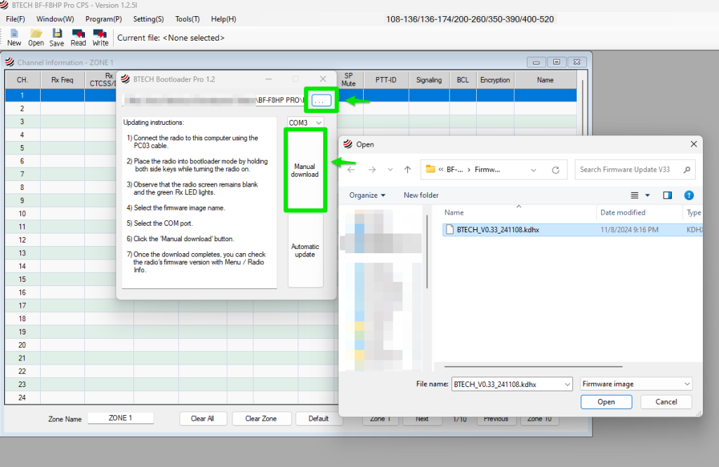 Note: If you accidentally attempt to update a non-compatible device, it may permanently damage or “soft-brick” the radio. For BF-F8HP PRO users, if any issues occur during the update process, performing a firmware flash with the correct V0.33 firmware should resolve them.