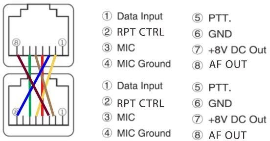 I can confirm the cable works as expected when pinned as diagramed. I have a BTECH UV-50X2 (Second Generation) configured for transmit and BTECH UV-25X2 (Second Generation) configured for receive. Not sure if it makes a difference but I have the end of the cable with brown on pin 8 connected to transmit and the end with blue on pin 8 connected to receive. Pin 7 and 1 are blank. I’m in the UHF band with a 5Mhz offset and a duplexer with 1 antenna. So far so good. No issues. I will update here if any problems arise. I will say that my noise level is a bit high. That could be for a number of reasons. But, the system is performing as expected. What I did to mitigate the noise as best I could is lower the volume on the receive radio as low as possible while still passing audio. The transmit radio has the volume nob all the way down. I have both radios set to EAR on menu 61. I am also using a large clamp on ferrite bead on the control cable since I used UTP CAT5 cable. I have ferrite toroids on the power cables of both radios. I have the radios on separate shelves approximately 2.5 feet apart.