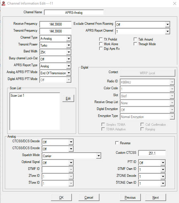 Once you’ve set this up, you have to set up an APRS channel. See the setup screen below to see how I have mine set up.