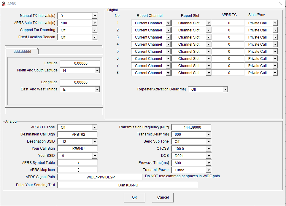 That should do it. To start sending APRS packets, select the APRS channel and press the push-to-talk switch. That will get the DMR-6X2 started sending out APRS packets at regular intervals. When it does send a packet, you’ll see the message, “Sending Ana Aprs Data” on the radio’s screen.